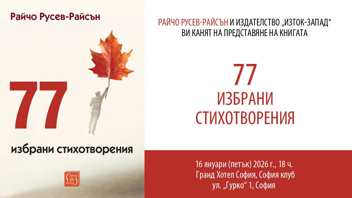 На 16 януари (петък) 2026 г. от 18 ч. в София клуб на Гранд Хотел София ще бъде представена стихосбирката на Райчо Русев-Райсън „77 избрани стихотворения“. Заповядайте на премиерата и чуйте поезията така, както звучи най-добре: на живо.