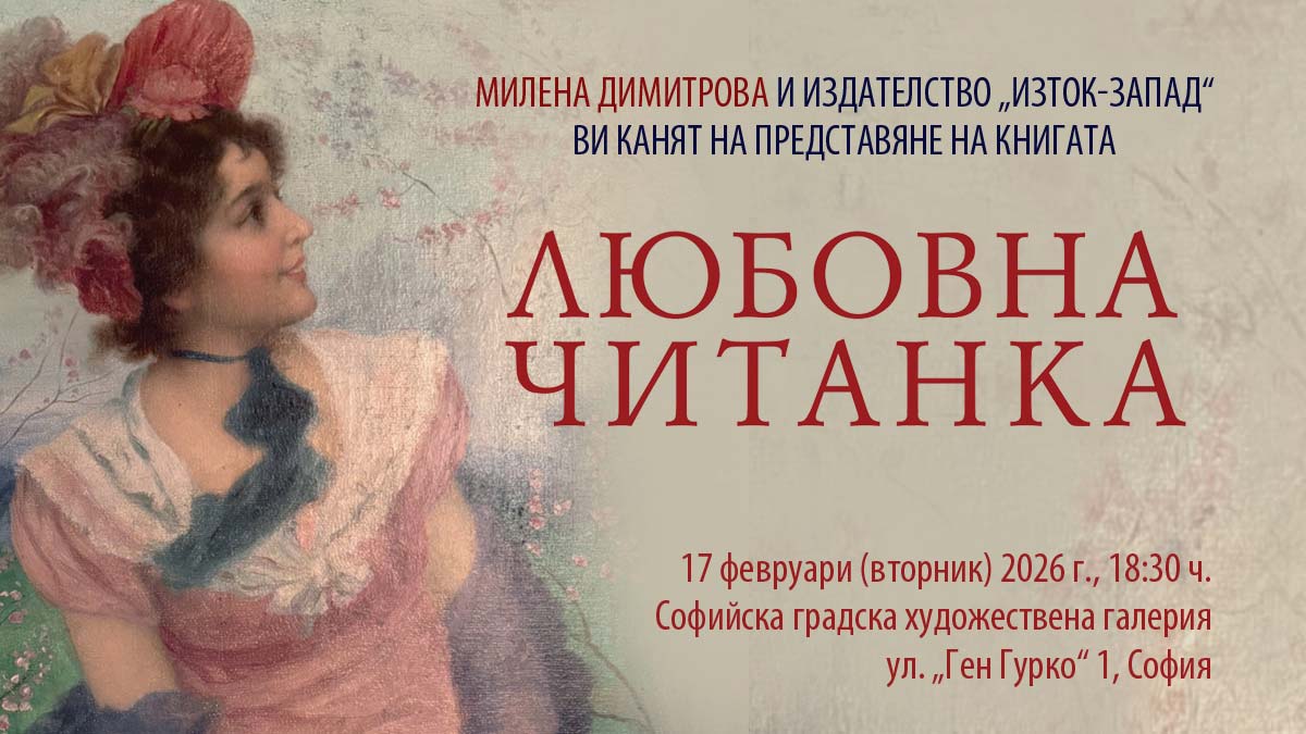 Заповядайте на премиерата на „Любовна читанка“ на Милена Димитрова – една необикновена колекция с истории отвъд баналната романтика. Очертава се пикантен и прелюбопитен разговор за генезиса на любовта в литературата, митологията и науката. С нас ще са любими лица от екрана и две от най-красивите български актриси. Елате и вие – започваме в 18:30 ч. на 17 февруари (вторник) 2026 г. в Софийска градска художествена галерия (ул. „Ген Гурко“ 1, София).