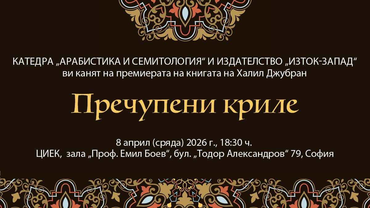 Заповядайте на премиерата на „Пречупени криле“ – история за безсмъртната любов от великия Халил Джубран. Разкошният превод от арабски език е дело на талантливата Надя Шобаш, която ще представи книгата и ще ни разкаже какво е да се превежда автор от такава величина. Ще си поговорим и за дълбоката мъдрост на Изтока и майсторството да бъде излята в думи. Очакваме ви на 8 април (сряда) 2026 г. от 18:30 ч. в зала „Проф. Емил Боев“ на ЦИЕК (бул. „Тодор Александров“ 79, София).